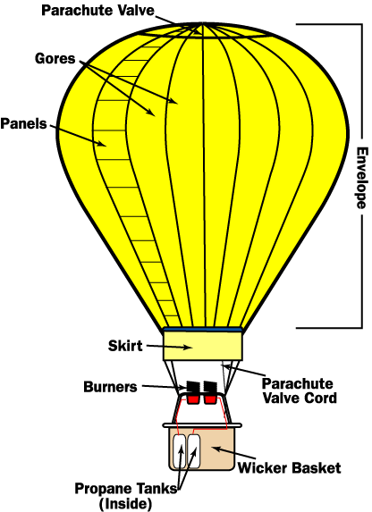 A hot air balloon is a lighter-than-air aircraft consisting of a bag, called an envelope, which contains heated air. Suspended beneath is a gondola or wicker basket (in some long-distance or high-altitude balloons, a capsule), which carries passengers and a source of heat, in most cases an open flame caused by burning liquid propane.